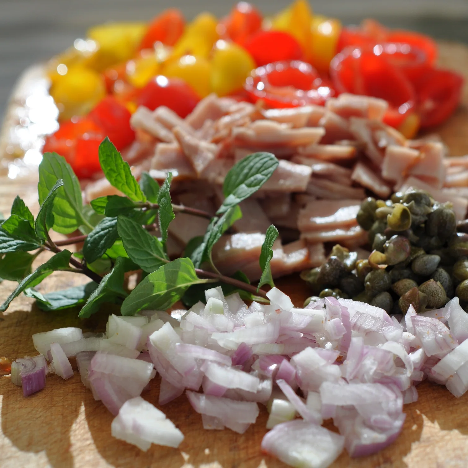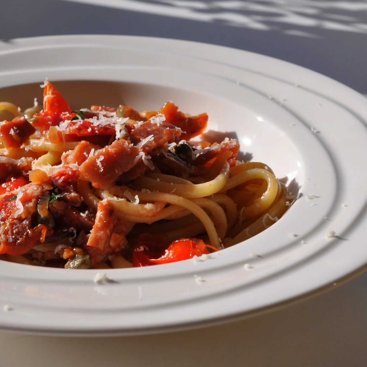 What Katie Ate » Spaghetti with tomato, bacon, mint and capers