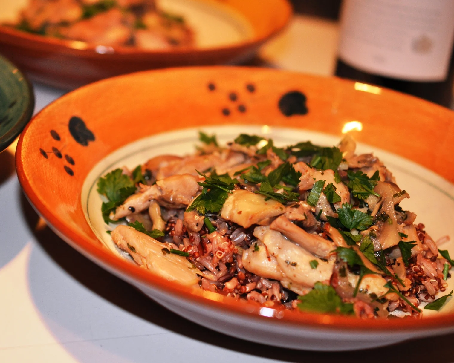 Thick stalks of rhubarb from a friend’s Waiheke garden deserved something more than a crumble. Family for Sunday night dinner provided the perfect excuse for a two courses. Chicken with Mushrooms and Tarragon Dish Issue 60 June / July 2015 worked a treat as our main, served on a bed of quinoa with brown and black rice. There was even enough for leftovers for lunch the next day.