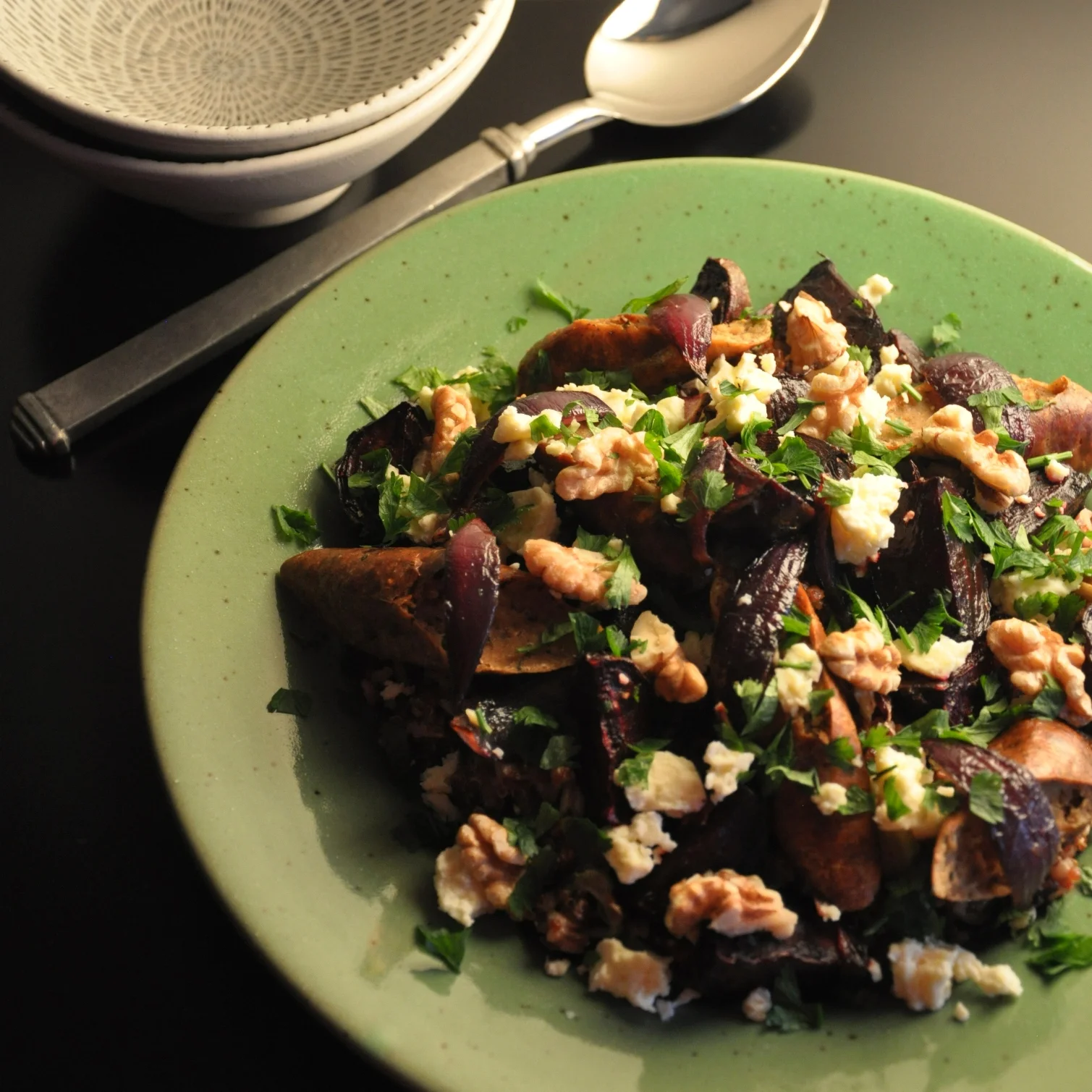 So here’s The Foodie Inc's take on the recipe, and by the way one more substitution – horseradish instead of Dijon mustard: Vegetarian Sausages, Quinoa, Walnuts and Feta.