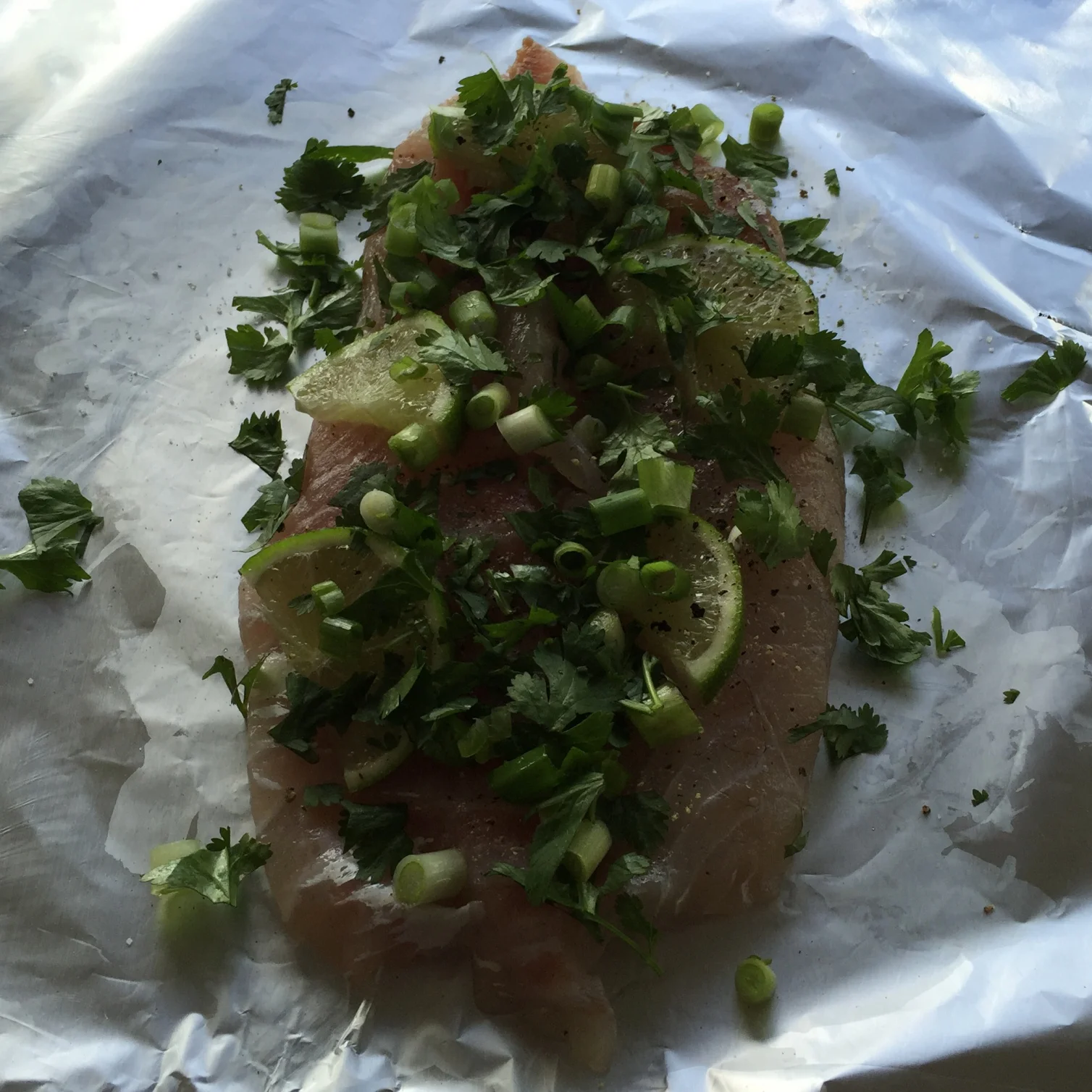 Snapper parcels topped with coriander lime and spring onions